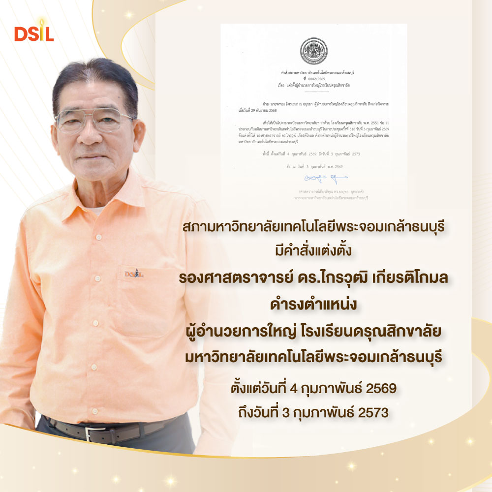 สภามหาวิทยาลัยเทคโนโลยีพระจอมเกล้าธนบุรีมีคำสั่งแต่งตั้ง รองศาสตราจารย์ ดร.ไกรวุฒิ เกียรติโกมลดำรงตำแหน่ง ผู้อำนวยการใหญ่ โรงเรียนดรุณสิกขาลัยมหาวิทยาลัยเทคโนโลยีพระจอมเกล้าธนบุรีตั้งแต่วันที่ 4 กุมภาพันธ์ 2569 ถึงวันที่ 3 กุมภาพันธ์ 2573