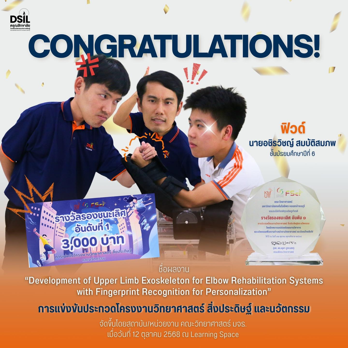 ขอแสดงความยินดีกับ นายอชิรวิชญ์ สมบัติสมภพ (ฟิวด์) ชั้นมัธยมศึกษาปีที่ 6 ที่ได้รับรางวัลรองชนะเลิศอันดับ 1 จากการแข่งขัน ประกวดโครงงานวิทยาศาสตร์ สิ่งประดิษฐ์ และนวัตกรรม เมื่อวันที่ 12 ตุลาคม 2568 ![]()