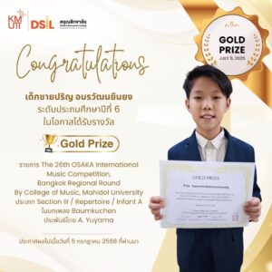 ขอแสดงความยินดีกับ ด.ช.ปริญ อมรวัฒนยืนยง ชั้นประถมศึกษาปีที่ 6 ได้รับรางวัล Gold Prize ในการแข่งขันรายการ The 26th OSAKA International Music Competition รอบ Bangkok Regional Round ประเภท Section III Repertoire / Infant A บทเพลง Baumkuchen by A. Yuyama จัดโดยวิทยาลัยดุริยางคศิลป์ มหาวิทยาลัยมหิดลเมื่อวันที่ 5 กรกฎาคม 2568