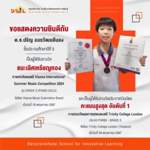 ขอแสดงความยินดีกับด.ช.ปริญ อมรวัฒนยืนยง ชั้นประถมศึกษาปีที่ 5 เป็นผู้ได้รับรางวัลชนะเลิศเหรียญทอง ในการแข่งขันดนตรี Vienna International Summer Music Competition 2024 รุ่น Grade 3 (Piano Solo) จัดโดย Vienna Music Examiation Board เมื่อวันที่ 18 พฤษภาคม 2567 และเป็นผู้ได้รับรางวัลประกาศนียบัตร คะแนนสูงสุด อันดับที่ 1 การสอบวัดผลการแสดงดนตรี Trinity College London ประเภท Piano-Grade 3 จัดโดย Trinity College London (Thailand) เมื่อวันที่ 30 พฤษภาคม 2567