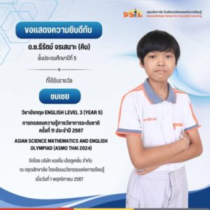 ขอแสดงความยินดีกับ .ด.ช.ธีรัตม์ จรเสนาะ (คิน) ชั้นประถมศึกษาปีที่ 5 เป็นผู้ได้รับรางวัลชมเชย ในการทดสอบความรู้ทางวิชาการระดับชาติ ครั้งที่ 11 ประจำปี 2567 ASIAN SCIENCE MATHEMATICS AND ENGLISH OLYMPIAD (ASMO THAI 2024) จัดโดย บริษัท แอสโม เอ็นดูเคชั่น จำกัด ณ ดรุณสิกขาลัย โรงเรียนนวัตกรรมแห่งการเรียนรู้ เมื่อวันที่ 1 พฤศจิกายน 2567
