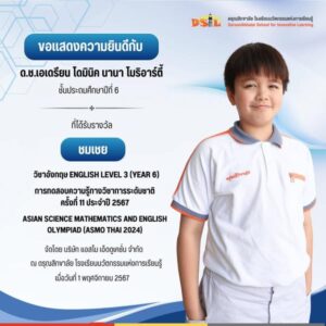 ขอแสดงความยินดีกับ ด.ช.เอเดรียน โดมินิค นานา โมริอาร์ตี้ ชั้นประถมศึกษาปีที่ 6 เป็นผู้ได้รับรางวัลชมเชย ในการทดสอบความรู้ทางวิชาการระดับชาติ ครั้งที่ 11 ประจำปี 2567 ASIAN SCIENCE MATHEMATICS AND ENGLISH OLYMPIAD (ASMO THAI 2024) จัดโดย บริษัท แอสโม เอ็นดูเคชั่น จำกัด ณ ดรุณสิกขาลัย โรงเรียนนวัตกรรมแห่งการเรียนรู้ เมื่อวันที่ 1 พฤศจิกายน 2567