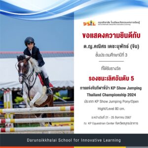 ขอแสดงความยินดีกับด.ญ.คณิศร เดชะนุพัทธ์ (จิน) ชั้นประถมศึกษาปีที่ 3 ที่ได้รับรางวัลรองชนะเลิศอันดับ 5 การแข่งขันกีฬาขี่ม้า KP Show Jumping Thailand Championship 2024 ประเภท KP Show Jumping Pony/Open Hight/Level 80 cm. ระหว่างวันที่ 21 – 25 สิงหาคม 2567 ณ KP Equestrian Center จังหวัดสมุทรปราการ