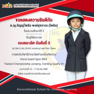 ขอแสดงความยินดีกับด.ญ.ภิญญ์ไพลิน พงษ์สุขถาวร (ไพลิน) ชั้นประถมศึกษาปีที่ 2 เป็นผู้ได้รับรางวัลรองชนะเลิศ อันดับ 3 รุ่น Start Lists ประเภท Jumping Lead Rein /Open ในการแข่งขันกีฬาขี่ม้ากระโดดข้ามเครื่องกีดขวาง Horse Guard Open 2024 Thailand Championship Jumping, Eventing Qualify #1 ระหว่างวันที่ 15 – 17 มีนาคม 2567