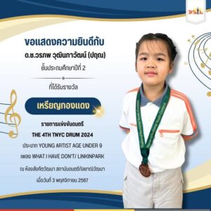 ขอแสดงความยินดีกับ ด.ช.วรภพ วุฒินภาวัฒน์ (ปฤณ) ชั้นประถมศึกษาปีที่ 2 เป็นผู้ได้รับรางวัลเหรียญทองแดง รายการแข่งขันดนตรี THE 4TH TNYC DRUM ประเภท YOUNG ARTIST AGE UNDER 9 เพลง WHAT HAVE DON’T/LINKNPARK ณ ห้องสังคีตวัฒนา สถาบันดนตรีกัลยาณีวัฒนา เมื่อวันที่ 3 พฤศจิกายน 2567