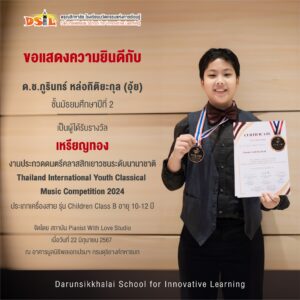 Congratulations to Purin Lokitiyakul (Oui), a Grade 8 student, for winning the gold medal in the Thailand International Youth Classical Music Competition 2024 in the Children Class B (ages 10-12) string category.