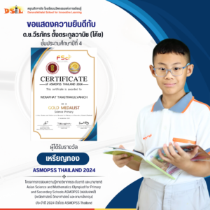 ขอแสดงความยินดีกับด.ช.วีรภัทร ตั้งตระกูลวนิช (โค้ช) ชั้นประถมศึกษาปีที่ 4 เป็นผู้ได้รับรางวัลเหรียญทอง ASMOPSS THAILAND 2024 โครงการทดสอบความรู้ทางวิชาการระดับชาติ และนานาชาติ Asian Science and Mathematics Olympiad for Primary and Secondary Schools ASMOPSS (คณิตศาสตร์ วิทยาศาสตร์ และภาษาอังกฤษ) ประจำปี 2024 จัดโดย ASMOPSS THAILAND ประกาศเมื่อวันที่ 9 กันยายน 2024