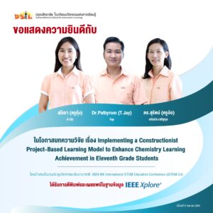 ขอแสดงความยินดีกับนางสโรชา คำบัว Dr.Puthyrom Tep (T.Jay) และดร.สุรัตน์ แท่นประเสริฐกุล (ครูอ้อ) ในโอกาสเขียนบทความวิจัยเรื่อง “Implementing a Constructionist Project-Based Learning Model to Enhance Chemistry Learning Achievement in Eleventh Grade Students” ได้รับการตีพิมพ์และเผยแพร่ในฐานข้อมูล IEEE Xplore® อ่านบทความฉบับเต็มได้ที่ https://doi.org/10.1109/iSTEM-Ed62750.2024.10663104