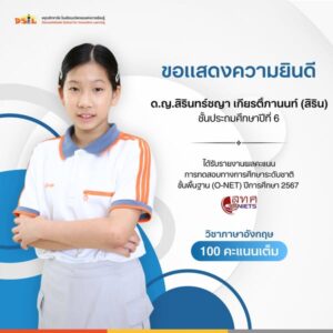 ขอแสดงความยินดีกับ ด.ญ.สิรินทร์ชญา เกียรติ์ภานนท์ (สิริน) นักเรียนชั้นประถมศึกษาปีที่ 6 ที่ได้ผลคะแนนวิชาภาษาอังกฤษ 100 คะแนนเต็ม จากการทดสอบทางการศึกษาระดับชาติขั้นพื้นฐาน (O-NET) ปีการศึกษา 2567