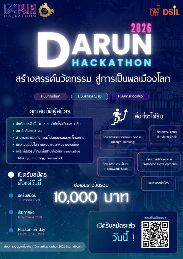 ขอเชิญชวนนักเรียนระดับชั้นมัธยมศึกษาที่มีใจรักด้านนวัตกรรม เข้าร่วม DARUNHACKATHON 2026 เวทีสำหรับเยาวชนในการพัฒนาไอเดีย สร้างสรรค์นวัตกรรม และยกระดับทักษะสำคัญในศตวรรษที่ 21 ทั้ง Innovative Thinking, Pitching และ Teamwork