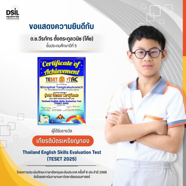💎 ขอแสดงความยินดีแก่ ด.ช.วีรภัทร ตั้งตระกูลวนิช (โค้ช) นักเรียนชั้นประถมศึกษาปีที่ 5 ได้รับเกียรติบัตรเหรียญทอง จากโครงการประเมินทักษะภาษาอังกฤษระดับประเทศ TESET 2025 (Thailand English Skills Evaluation Test) ครั้งที่ 6 จัดโดย สถาบันภาษา มหาวิทยาลัยธรรมศาสตร์ เพื่อส่งเสริมและพัฒนาศักยภาพด้านภาษาอังกฤษของเยาวชนไทย 💬📚✨ ขอชื่นชมในความพยายาม ความตั้งใจ และความมุ่งมั่นของนักเรียน ขอเป็นกำลังใจให้ก้าวสู่การพัฒนาศักยภาพด้านภาษาอังกฤษต่อไปอย่างไม่หยุดยั้ง 🌟