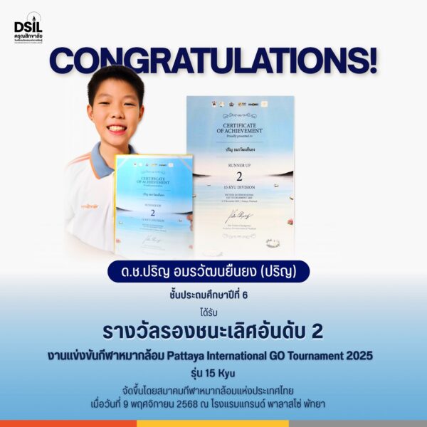 ขอแสดงความยินดีกับ ด.ช.ปริญ อมรวัฒนยืนยง (ปริญ) นักเรียนชั้นประถมศึกษาปีที่ 6 คว้ารางวัลรองชนะเลิศอันดับ 2 จากการแข่งขันกีฬาหมากล้อม Pattaya International GO Tournament 2025 รุ่น 15 Kyu การแข่งขันจัดขึ้นเมื่อวันที่ 9 พฤศจิกายน 2568 โดย สมาคมกีฬาหมากล้อมแห่งประเทศไทย โรงเรียนขอชื่นชมในความสามารถ ความตั้งใจ และความมุ่งมั่นของนักเรียน ขอเป็นกำลังใจให้ก้าวหน้าพัฒนาทักษะอย่างต่อเนื่องต่อไป