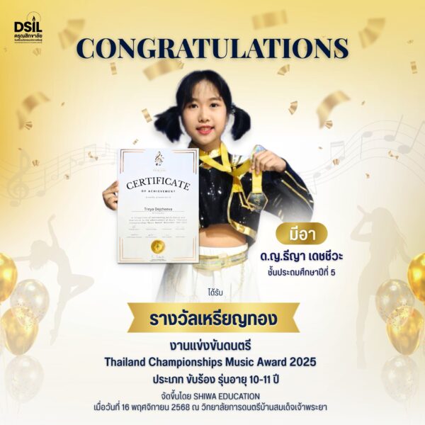 ขอแสดงความยินดีกับความสำเร็จของ “มีอา” โรงเรียนดรุณสิกขาลัย ขอแสดงความยินดีกับ ด.ญ.ธีญา เดชชีวะ (มีอา) ชั้น ป.5 ผู้ได้รับ รางวัลเหรียญทอง จากการแข่งขันดนตรี Thailand Championships Music Award 2025 ประเภทขับร้อง – รุ่นอายุ 10–11 ปี จัดขึ้นเมื่อวันที่ 16 พฤศจิกายน 2568 ณ วิทยาลัยการดนตรีบ้านสมเด็จเจ้าพระยา จัดโดย SHIWA EDUCATION ขอชื่นชมในความสามารถและความมุ่งมั่นของน้องมีอา พร้อมขอเป็นกำลังใจให้ก้าวต่อไปบนเส้นทางดนตรีอย่างงดงาม