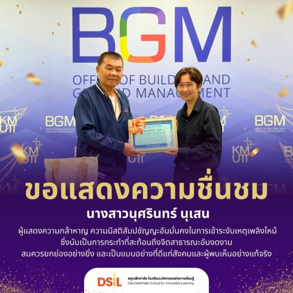 ดรุณสิกขาลัย โรงเรียนนวัตกรรมแห่งการเรียนรู้ ขอประกาศชื่นชม นางสาวนุศรินทร์ นุเสน (ครูนุ) บุคลากรดรุณสิกขาลัย ผู้ได้รับมอบของที่ระลึกและเกียรติบัตรประกาศเกียรติคุณจาก คุณประพนธ์ เรืองวุฒิชนะพืช ที่ปรึกษาอธิการบดี ในนามสำนักบริหารอาคารและสถานที่ มหาวิทยาลัยเทคโนโลยีพระจอมเกล้าธนบุรี (มจธ.) ที่ได้แสดงความกล้าหาญ สติสัมปชัญญะ และความเสียสละ โดยเข้าช่วยเหลือระงับเหตุเพลิงไหม้อย่างทันท่วงที เหตุการณ์นี้สะท้อนถึงจิตสาธารณะ ความรับผิดชอบต่อส่วนรวม ของครูนุ อันควรค่าแก่การยกย่อง การเข้าระงับเหตุดังกล่าวของของครูนุไม่เพียงช่วยป้องกันความสูญเสียที่อาจเกิดขึ้น แต่ยังช่วยเสริมสร้างความปลอดภัยให้แก่บุคลากรและผู้คนโดยรอบ นับเป็นแบบอย่างที่ดีของบุคลากรผู้มีจิตสำนึกเพื่อสังคมอย่างแท้จริง