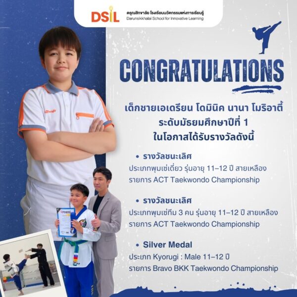 ขอแสดงความยินดีกับเด็กชายเอเดรียน โดมินิค นานา โมริอาตี้ ระดับมัธยมศึกษาปีที่ 1 ที่ได้รับรางวัลจากการแข่งขันเทควันโดในหลายรายการ ดังนี้ ชนะเลิศ – ประเภทพุมเซ่เดี่ยว รุ่นอายุ 11–12 ปี สายเหลือง รายการ ACT Taekwondo Championship ชนะเลิศ – ประเภทพุมเซ่ทีม 3 คน รุ่นอายุ 11–12 ปี สายเหลือง รายการ ACT Taekwondo Championship Silver Medal – ประเภท Kyorugi : Male 11–12 ปี รายการ Bravo BKK Taekwondo Championship ขอชื่นชมในความวิริยะ อุตสาหะ และความมุ่งมั่นของนักเรียน โรงเรียนขอเป็นกำลังใจให้นักเรียนก้าวสู่ความสำเร็จที่สูงยิ่งขึ้นต่อไป