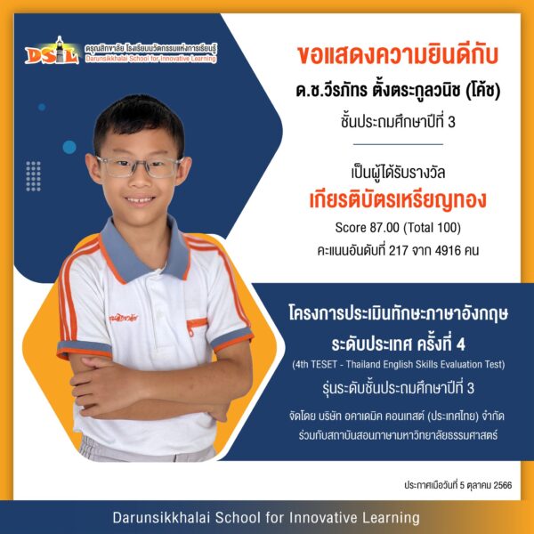 ขอแสดงความยินดีกับ ด.ช.วีรภัทร ตั้งตระกูลวนิช (โค้ช) ชั้นประถมศึกษาปีที่ 3 เป็นผู้ได้รับรางวัลเกียรติบัตรเหรียญทอง ผลคะแนนสอบภาษาอังกฤษ 87 คะแนน อยู่อันดับที่ 217 จาก 4916 คน ในโครงการประเมินทักษะภาษาอังกฤษระดับประเทศ ครั้งที่ 4 ประจำปี 2566 4th TESET – Thailand English Skills Evaluation Test