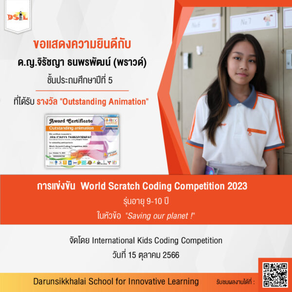 ขอแสดงความยินดีกับด.ญ.จิรัชญา ธนพรพัฒน์ (พราวด์) ชั้นประถมศึกษาปีที่ 5 เป็นผู้ได้รับรางวัล "Outstanding Animation" ในการแข่งขัน World Scratch Coding Competition 2023 รุ่นอายุ 9-10 ปี ในหัวข้อ "Saving our planet !"