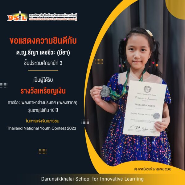 ขอแสดงความยินดีกับด.ญ.ธีญา เดชชีวะ (มีอา) ชั้นประถมศึกษาปีที่ 3 เป็นผู้ได้รับรางวัลหรียญเงิน การร้องเพลงภาษาต่างประเทศ (เพลงสากล) รุ่นอายุไม่เกิน 10 ปี ในการแข่งขันเยาวชน Thailand National Youth Contest
