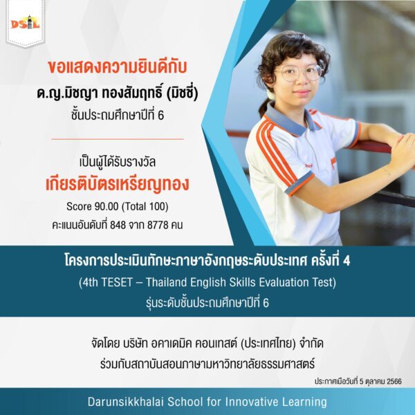 ขอแสดงความยินดีกับด.ญ.มิชญา ทองสัมฤทธิ์ (มิชชี่) ชั้นประถมศึกษาปีที่ 6 เป็นผู้ได้รับรางวัลเกียรติบัตรเหรียญทอง ผลคะแนนสอบภาษาอังกฤษ 90 คะแนน อยู่อันดับที่ 848 จาก 8778 คน ในโครงการประเมินทักษะภาษาอังกฤษระดับประเทศ ครั้งที่ 4 ประจำปี 2566 4th TESET – Thailand English Skills Evaluation Test