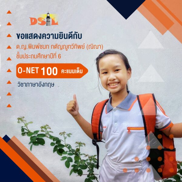 ขอแสดงความยินดีกับเด็กหญิงพิมพ์ชนก กตัญญูทวีทิพย์ (ณิณา) ชั้นประถมศึกษาปีที่ 6 ได้รับการรายงานผลคะแนนการทดสอบทางการศึกษาระดับชาติขั้นพื้นฐาน (O-NET) ปีการศึกษา 2565 วิชาภาษาอังกฤษ 100 คะแนนเต็ม