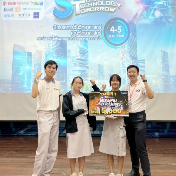 ขอแสดงความยินดีกับนายณพงศธร ทรงสวัสดิ์ (กิมจิ) ด.ญ.วรัมภร สิริจุติกุล (ฟ้าใส) ด.ญ.รรินทิพย์ อารีย์วัฒนะธรรม (ทาม) นักเรียนมัธยมศึกษาปีที่ 3 และ นายรชานนท์ มั่นกิจ (ครูที่ปรึกษา) ได้รับรางวัลชนะเลิศอันดับ 1 โครงงานวิทยาศาสตร์ หัวข้อ “ฤทธิ์ขจัดอนุมูลอิสระของผลิตภัณฑ์เครื่องดื่มคอมบูชาจากชาดำ ชาเขียว และชาอู่หลง” ในงานนิทรรศการวันวิทยาศาสตร์ “Science Today is Technology Tomorrow” เมื่อวันที่ 4 สิงหาคม 2566