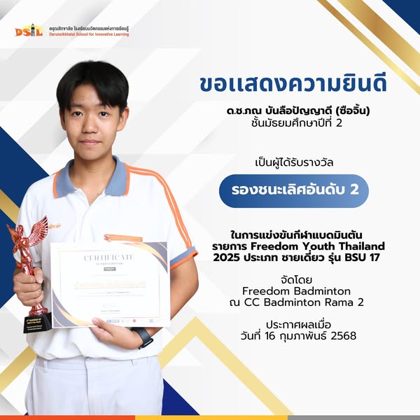 ขอแสดงความยินดีกับ ด.ช.ภณ บันลือปัญญาดี (ซือจิ้น) ชั้นมัธยมศึกษาปีที่ 2 ได้รับรางวัล รองชนะเลิศอันดับ 2 ประเภท ชายเดี่ยว รุ่น BSU 17 ในการแข่งขันแบดมินตันรายการ Freedom Youth Thailand 2025 จัดโดย Freedom Badminton ณ CC Badminton Rama 2 ประกาศผลเมื่อวันที่ 16 กุมภาพันธ์ 2568
