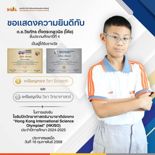ขอแสดงความยินดีกับด.ช.วีรภัทร ตั้งตระกูลวานิช (โค้ช) ชั้นประถมศึกษาปีที่ 4 เป็นผู้ได้รับรางวัลเหรียญทอง วิชา Scratch และ เหรียญเงิน วิชาวิทยาศาสตร์ ในการแข่งขันโอลิมปิกวิทยาศาสตร์นานาชาติฮ่องกง "Hong Kong International Science Olympiad" (HKISO) ประจำปีการศึกษา 2024-2025 จัดโดย Olympiad Champion Education Center - Thailand เมื่อวันที่ 16 กุมภาพันธ์ 2568