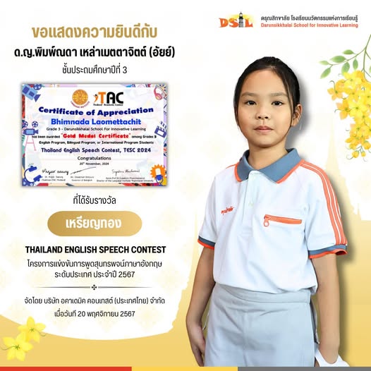 ขอแสดงความยินดีกับ ด.ญ.พิมพ์ณดา เหล่าเมตตาจิตต์ (อัยย์) ชั้นประถมศึกษาปีที่ 3 ได้รับรางวัลเหรียญทอง Thailand English Speech Contest โครงการแข่งขันการพูดสุนทรพจน์ภาษาอังกฤษระดับประเทศ ประจำปี พ.ศ. 2567 จัดโดย บริษัท อคาเดมิก คอนเทสต์ (ประเทศไทย) จำกัด เมื่อวันที่ 20 พฤศจิกายน 2567