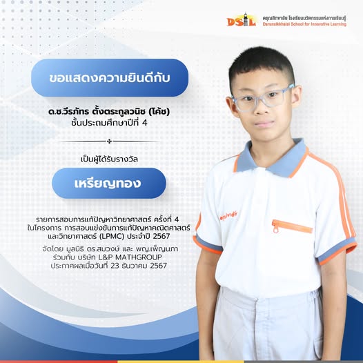 ขอแสดงความยินดีกับ ด.ช.วีรภัทร ตั้งตระกูลวนิช (โค้ช) ชั้นประถมศึกษาปีที่ 4 เป็นผู้ได้รับรางวัลเหรียญทอง รายการสอบการแก้ปัญหาวิทยาศาสตร์ ครั้งที่ 4 ในโครงการการสอบแข่งขันการแก้ปัญหาคณิตศาสตร์และวิทยาศาสตร์ (LPMC) ประจำปี 2567 จัดโดย มูลนิธิ ดร.สมวงษ์ และ พญ.เพ็ญนภา ร่วมกับ บริษัท L&P MATHGROUP ประกาศผลเมื่อวันที่ 23 ธันวาคม 2567
