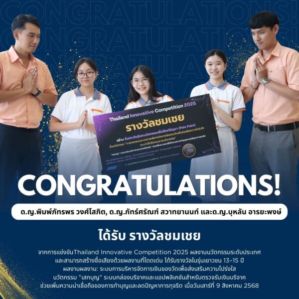 ขอแสดงความยินดีกับ นายธีดี กุลบุศย์ นักเรียนชั้นมัธยมศึกษาปีที่ 4 ที่ผ่านเข้าแข่งขันรอบชิงชนะเลิศและได้รับทุนสนับสนุนพัฒนาผลงาน ในการแข่งขันพัฒนาโปรแกรมคอมพิวเตอร์แห่งประเทศไทย (The 27th National Software Contest: NSC 2025) ซึ่งจัดโดยสำนักงานพัฒนาวิทยาศาสตร์และเทคโนโลยีแห่งชาติ (สวทช.) และสำนักงานการวิจัยแห่งชาติ (วช.) เมื่อวันที่ 8 สิงหาคม 2568 ชื่อผลงาน “Liquid Life : The Water Journey” ประเภทโปรแกรมเพื่อความบันเทิง ระดับนักเรียน