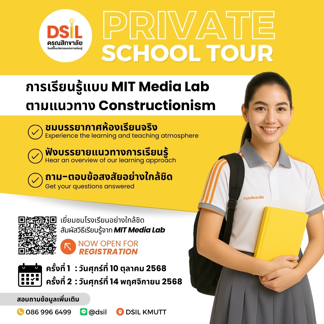DSIL Private School Tour!! โอกาสพิเศษสำหรับผู้ปกครองและนักเรียนที่สนใจจะเข้าร่วมชมบรรยากาศการเรียนการสอนจริงภายในโรงเรียน จัดการเรียนรู้หลักสูตร Project-based Learning ตามแนวทาง Constructionism สู่การเป็นนวัตกรแห่งอนาคต